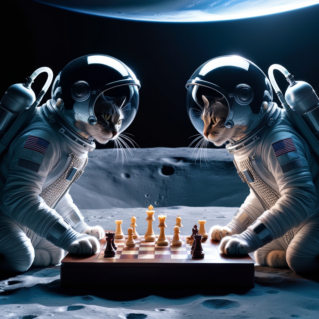 In a vast, ancient lunar crater, two space-suited felines, their helmets reflective like polished steel, sit across from each other, intensely focused on a levitating chessboard, the pieces suspended in mid-air due to the moon's low gravity. The board's squares shimmer with a soft, ethereal glow, illuminating the cats' whiskers and the intricate, woven patterns on their suits. Beyond the crater's rim, the curved horizon of the Earth glows like a brilliant blue and white marble, suspended in the inky blackness of space. The cats' suits are adorned with small, gleaming oxygen tanks and utility pouches, with thin, flexible tubes connecting their helmets to their backpacks. One cat's paw hovers over a pawn, its claws extended, as if pondering the next move in the celestial game.
