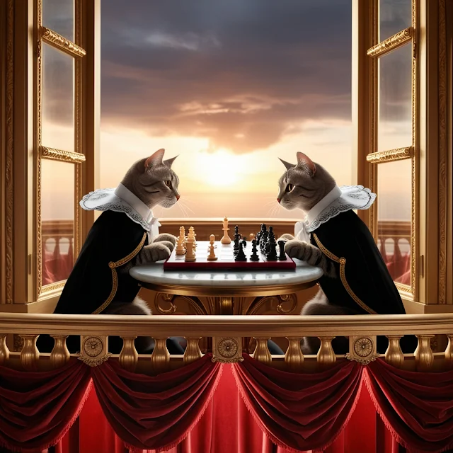 In a lavish opera house balcony, two refined aristocratic cats, adorned with intricately designed tiny opera capes, sit poised across from each other, intently focused on a game of chess unfolding on a polished marble table, the board's squares reflecting the warm glow of the gilded surroundings. The soft, warm light of the setting sun seeps through the ornate balcony rails, casting a gentle glow on the felines' sleek fur, their whiskers twitching with anticipation as they ponder their next move. Below, the dramatic stage lights illuminate the plush red velvet curtains, which cascade in folds, creating a sense of opulence and grandeur. The cats' refined features, with slender noses, almond-shaped eyes, and soft, fluffy ears, are illuminated by the soft light, their tranquil demeanor a striking contrast to the high-stakes game of strategy unfolding before them.